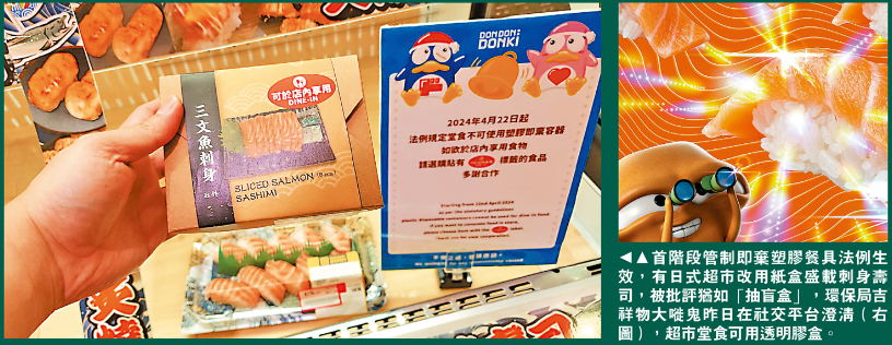 首阶段措施下,胶杯、胶碗、胶饭盒包括胶盖、封口胶膜,可以外卖使用,但禁止堂食使用。日式连锁超市DON DON DONKI近日将盛载刺身或寿司盒,改用附有寿司相片的密实纸盒盛载,并在门口及冻柜位置贴出告示,标明“法例规定堂食不可使用塑胶即弃容器”,场内另有以透明胶盒包装的寿司供顾客外卖,纸盒包装寿司贴有“只供在店内享用”字句。不少顾客质疑,寿司讲求新鲜,包装转用纸盒难以看清楚,如同“盲盒”,降低购买意欲。
