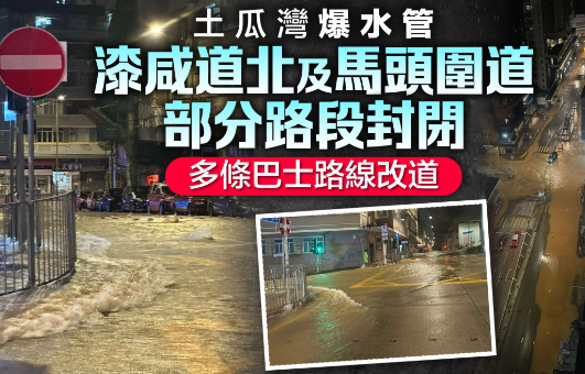 土瓜湾漆咸道北近新围街今日(13日)凌晨时分爆水管,大量黄泥水涌出路面。运输署表示,因水管爆裂,漆咸道北(往尖沙咀方向)介乎马头围道与新围街之间的全线;马头围道(往尖沙咀方向)介乎浙江街与漆咸道北之间的全线封闭。
