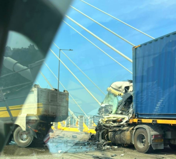 事发在早上9时许,一辆私家车、一辆重型货车、一辆中型货车和一辆拖头车相撞,拖头车车头严重损毁,扭曲变形,司机一度被困。