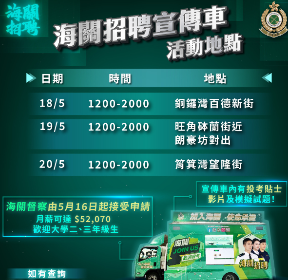新一轮香港海关督察招募已经展开,海关招聘宣传车也到全港各区宣传。海关宣传车今日(18日)到铜锣湾百德新街,明日到旺角砵兰街近朗豪坊对出,而周一则会到筲箕湾望隆街。