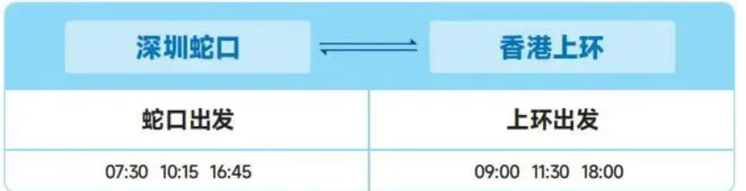 上环至蛇口航线,每日从上环港澳码头开出的时间为09:00、11:30、20:00;而从蛇口客运码头开出的时间为每日07:30、10:15、16:45,船程约需50分钟。