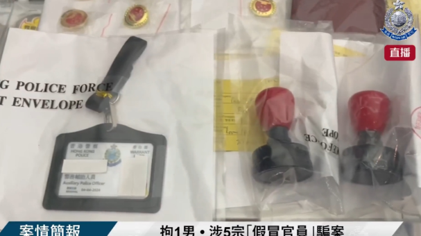 警方今日(23日)以“以欺骗手段取得财产”罪拘捕一名25岁男子,涉嫌与5宗在今年4月发生的“假冒官员”骗案有关,涉案金额高达400万。人员在其住所检获一张伪造的警察委任证、公安徽章、公安和金管局盖印、打印机、过胶机等。被捕人士现正被扣留调查。