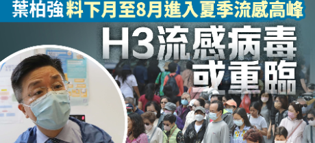 香港大学儿童及青少年科学系临床教授叶柏强今日(6月1日)于电台节目表示,过去冬季流感高峰通常会在4月回落,但数据显示本港流感个案至6月仍未有缓和迹象,预计下月至8月会进入夏季流感高峰,有小型爆发,届时H3流感病毒有机会重临,不过由于天气较热,预计病毒传播力及杀伤力会较冬季流感高峰低。