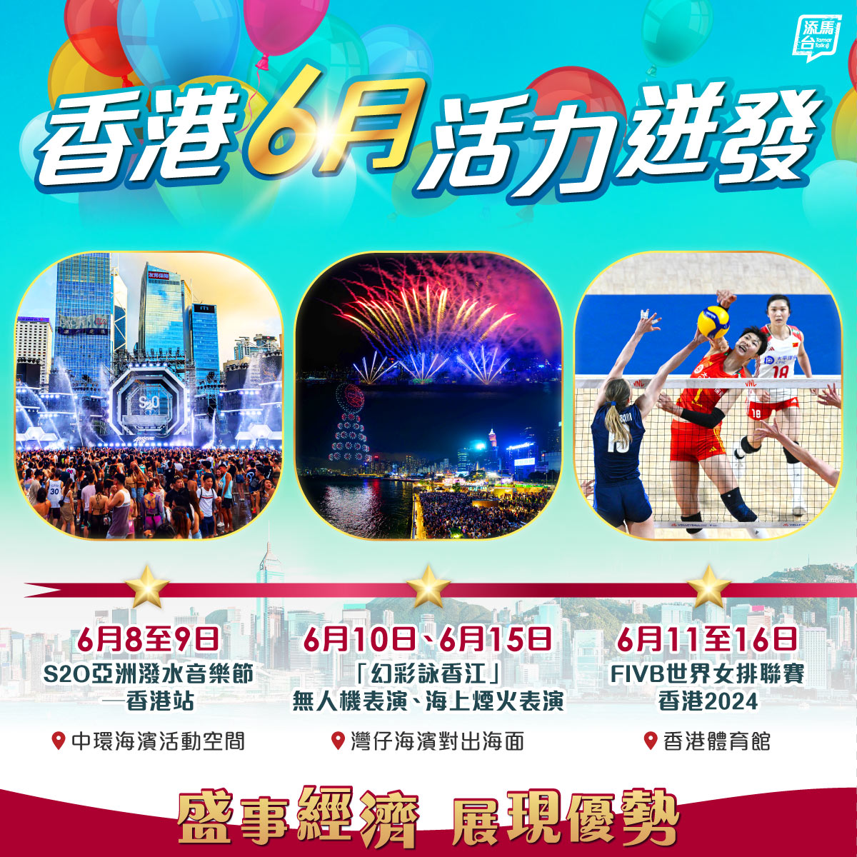 香港盛事浪接浪,到了6月更迸发全新活力,不仅有全球最大型泼水音乐派对“S2O亚洲泼水音乐节”及环球赛事“香港国际龙舟邀请赛”载誉归来,亦有配合节庆活动、于端午节当晚及国际龙舟赛首晚在湾仔海滨上演的无人机及海上烟火表演,还有包括中国队在内等多支劲旅参赛的“世界女排联赛”。