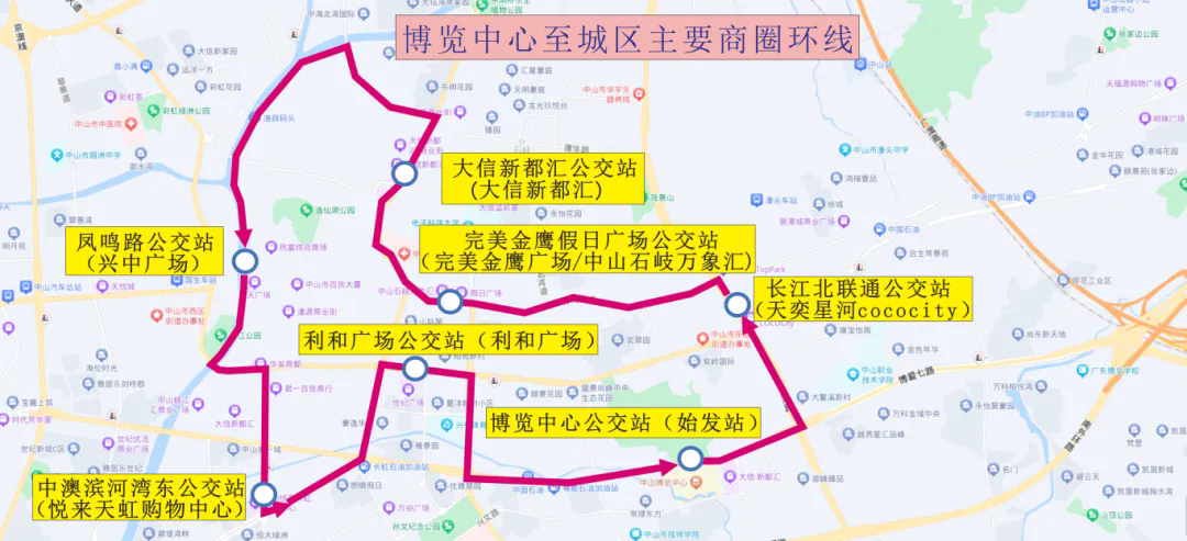 博览中心站、天奕星河COCO City(长江北联通公交站)、完美金鹰广场/中山石岐万象汇(完美金鹰假日广场公交站)、大信新都汇站、兴中广场(凤鸣路公交站)、悦来天虹购物中心(中澳滨河湾东公交站)、利和广场站、博览中心站