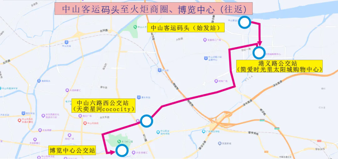 中山客运码头、简爱时光里太阳城购物中心(港义路公交站)、天奕星河COCO City(中山六路西公交站)、博览中心站