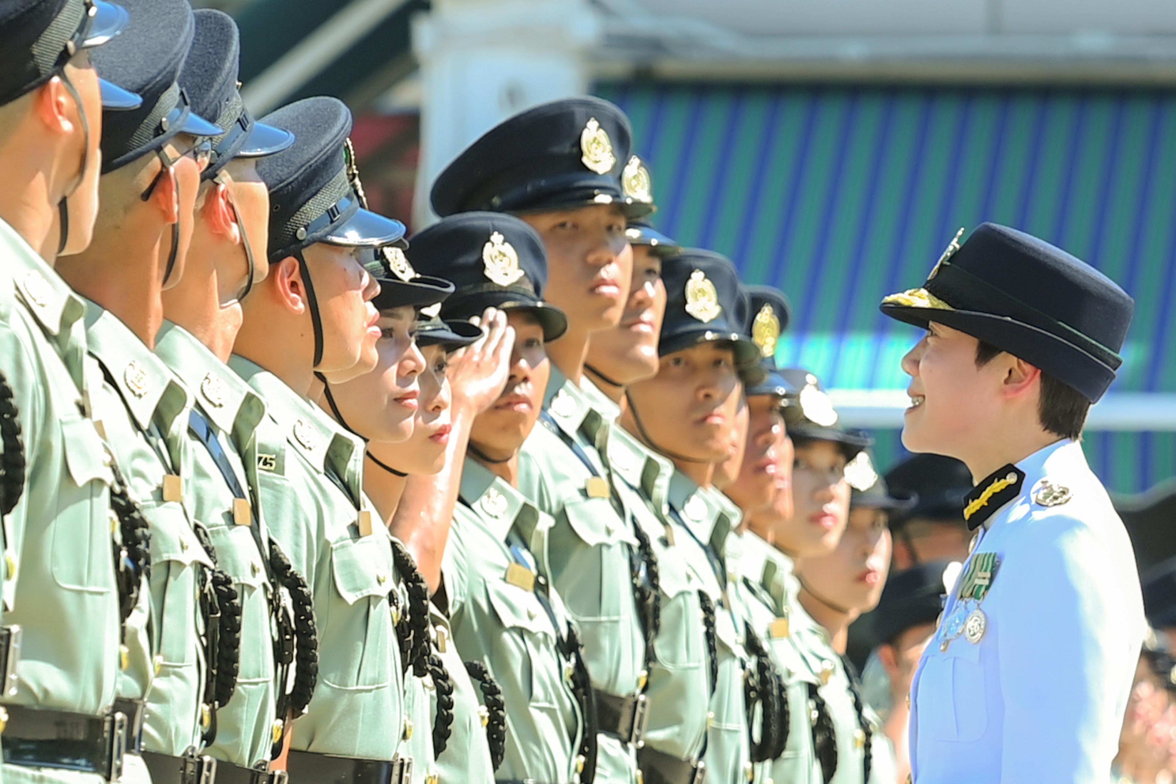 何珮珊(右一)今日在香港海关学员结业会操检阅结业学员。(政府新闻处)
