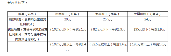 运输署今日(13日)宣布,巿区、新界及大屿山的士新收费将由明日(14日)起生效,落旗收费较前增加2元,落旗后首段跳錶收费每跳增加2毫,后段跳錶收费则每跳增加1毫。