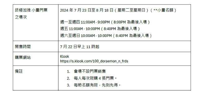 全球最大型多啦A梦展览之一的“100%多啦A梦&FRIENDS”巡回特展,5月公开发售收费展区门票后旋即售罄,随后两度加推亦极速被抢购一空。 由于不少粉丝反映期望可以入场,主办单位AllRightsReserved今日(19日)宣布,将为由7月23日(星期二)至8月18日(星期日)收费展区的余下场次,终极加推小量名额,供粉丝订购。 新增门票将于7月22日(星期一)早上11时在Klook平台公开发售。