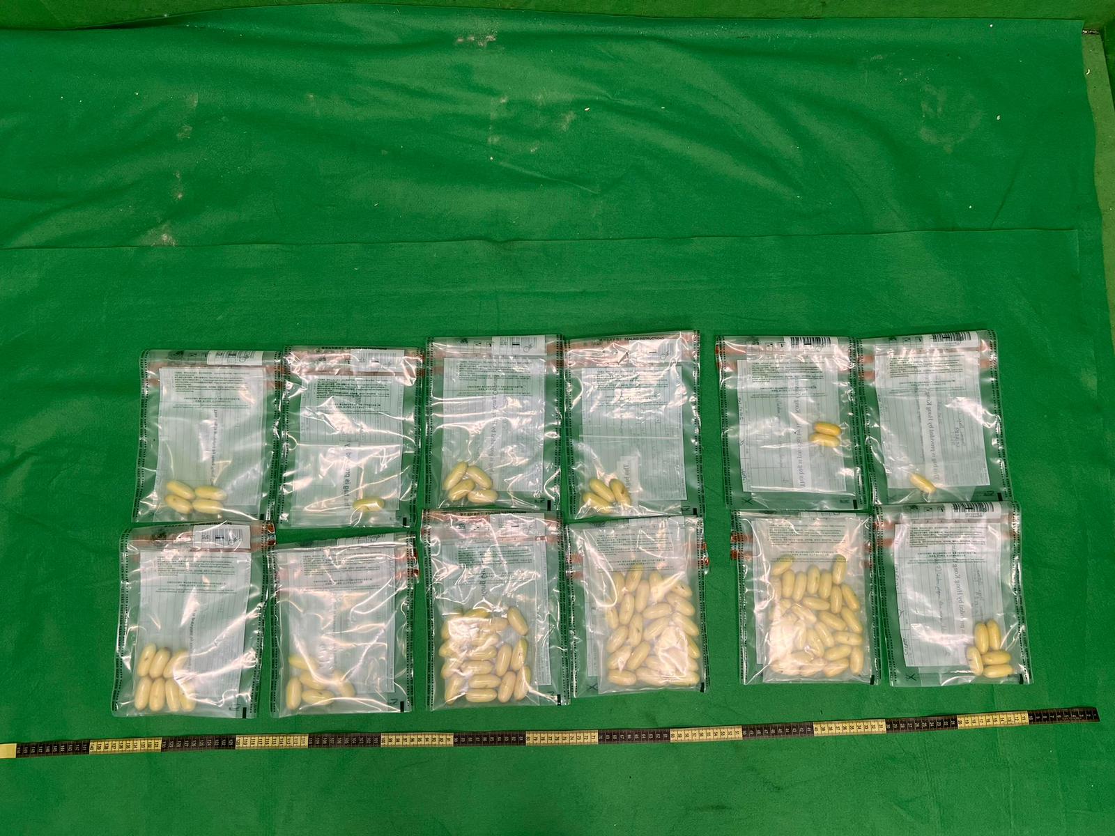 检查结果确认该两名旅客体内藏有异物,海关人员随即把他们拘捕。 截至今日(21日)下午3时,两名被捕人士已从体内排出97粒共重约1公斤的怀疑可卡因,估计市值约70万元。