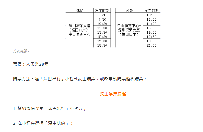 专线每日合共提供8对班次,即往来方向合共16班,最早在早上8时30分由福田出发、尾班车为晚上6时30分。而由中山返福田头班车为早上10时30分,尾班车为晚上9时,每程只需人民币28元。