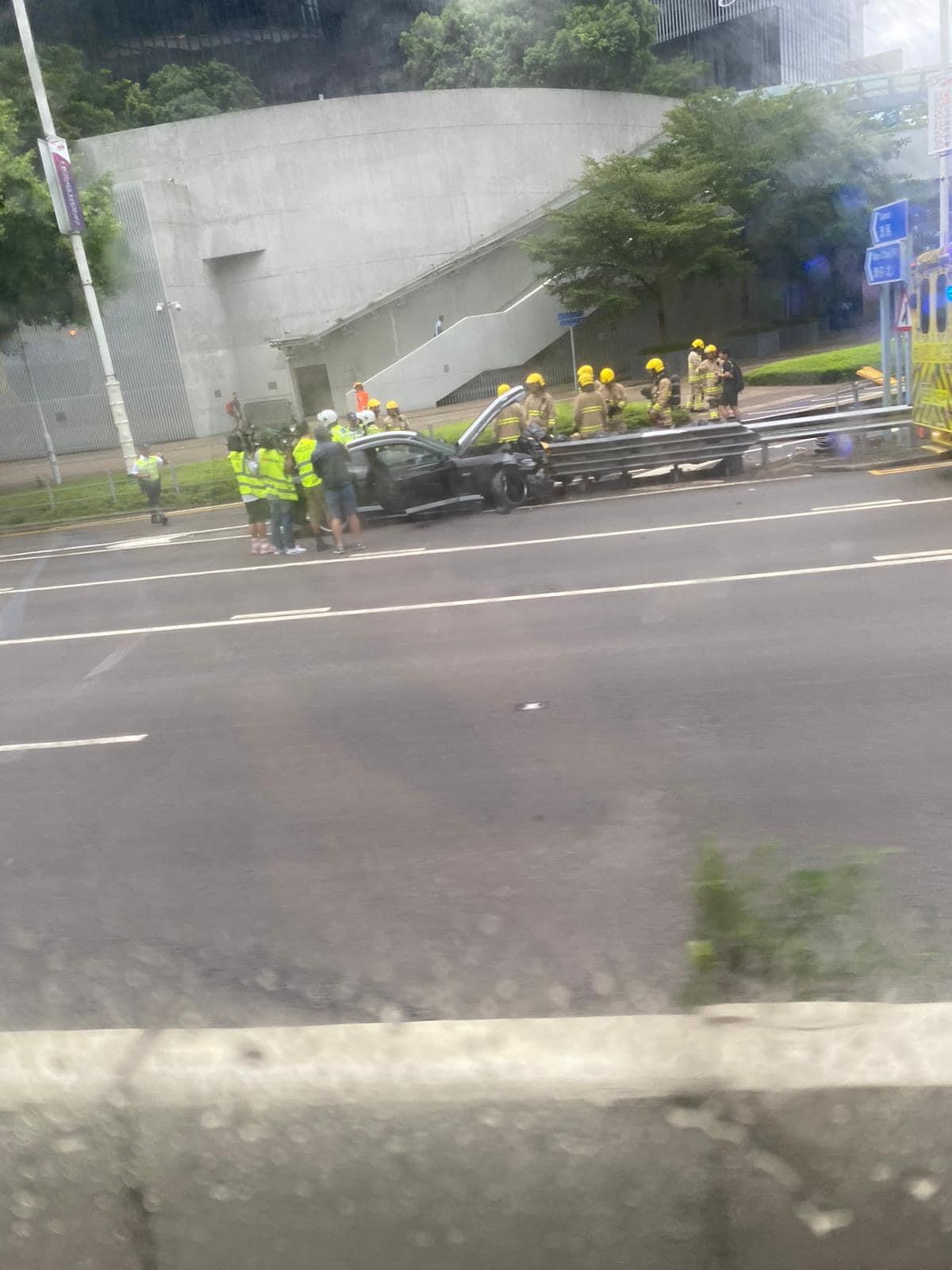 金钟福特野马跑车直撞风琴栏。(FB图片)运输署宣布,因交通意外,夏慤道(往湾仔方向)近添美道的部分行车线一度封闭,现已解封。