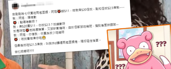 买东西时难免会遇到店员算错或找错钱的时候,近日有网民分享在便利店付款时,与店员的爆笑互动,指当日买$11两盒豆浆,付了$20后,收银阿姐只找他$2.5,他表示“唔啱数”,对方揿过计数机后,最后竟找回$21.5,令他十分无语。