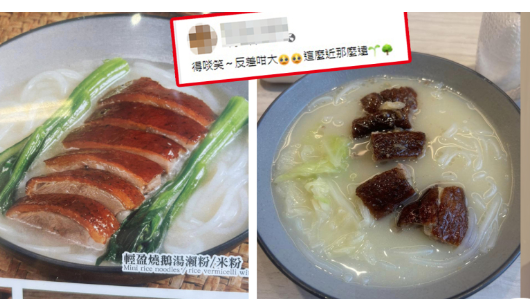 该网民在fb群组“香港茶餐厅及美食关注组”发文指,自己日前光顾了某连锁集团餐厅,点叫一碗名为“轻盈烧鹅汤濑粉”。从其上载的照片可见,餐牌上烧鹅濑粉色泽油亮,肥美可口,两旁还有菜心作点缀,令人食指大动。惟上枱后的烧鹅濑粉却只有瘦骨如柴、看似“烧燶咗”的烧鹅,而菜心亦被黄芽白取代,卖相与餐牌图片相差甚远。