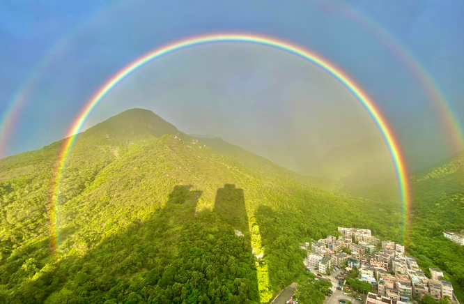 本港近日天气不稳、时晴时雨,不时可以见到彩虹挂在天边,网上“产出”不少靓相。早前有人在东涌拍到了罕见的双彩虹,其形状更接近圆形,连香港天文台都发文称是“难得一见”的奇观。