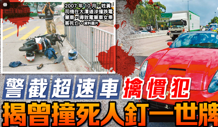 香港警方新界南总区交通部执行及管制组特遣队人员,前日下午在屯门公路近汀九桥侦测到一辆红色法拉利跑车,以超越两倍路面限速(70公里)的高速狂飙,严重影响其他道路使用者安全。警员将该私家车截停,以涉嫌5宗罪拘捕46岁男司机,揭发该名男子自2004年一拿到驾照就成为“马路炸弹”,多次因为危驾坐监兼被罚停牌,但屡罚屡犯,其中一次更导致一名女子死亡,但他不知悔改续在马路狂飙,于2018年终被法庭判处永久停牌。有人至此仍恶习不改,续罔顾他人安全亡命飞车,幸被警方再次截获。