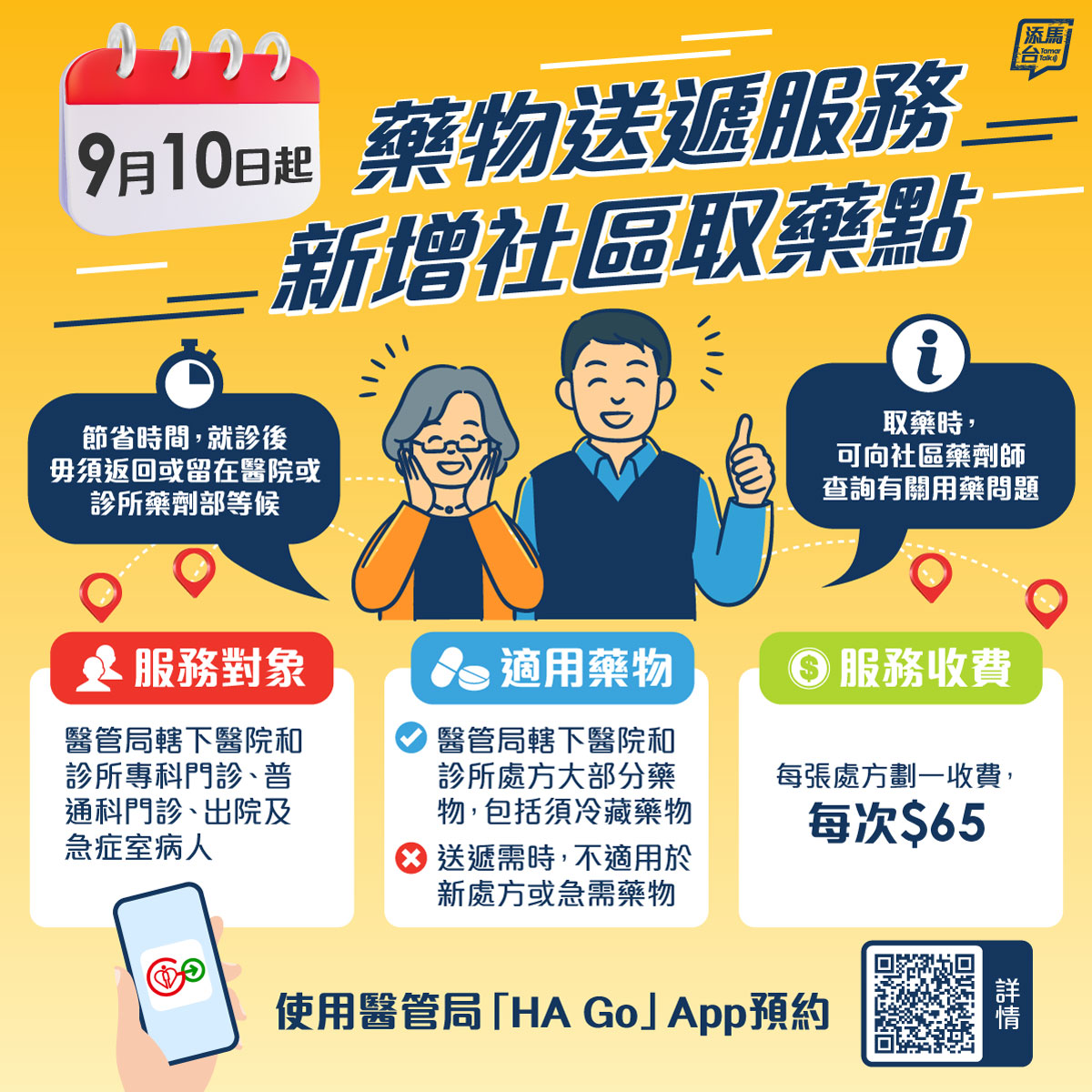 医管局与大型连锁药房协作提供社区取药服务。病人诊症后可经医管局手机应用程式HA Go安排把药物送到家中、办公室或社区取药点。药物送达社区取药点后,病人会收到HA Go和社区取药点药剂师的通知,需于3个工作天内领取药物,并在取药时出示HA Go二维码核对身份。药剂师会与病人核对药物,同时,病人若有任何与用药有关的问题,可于社区取药点领取药物时,向药剂师查询。