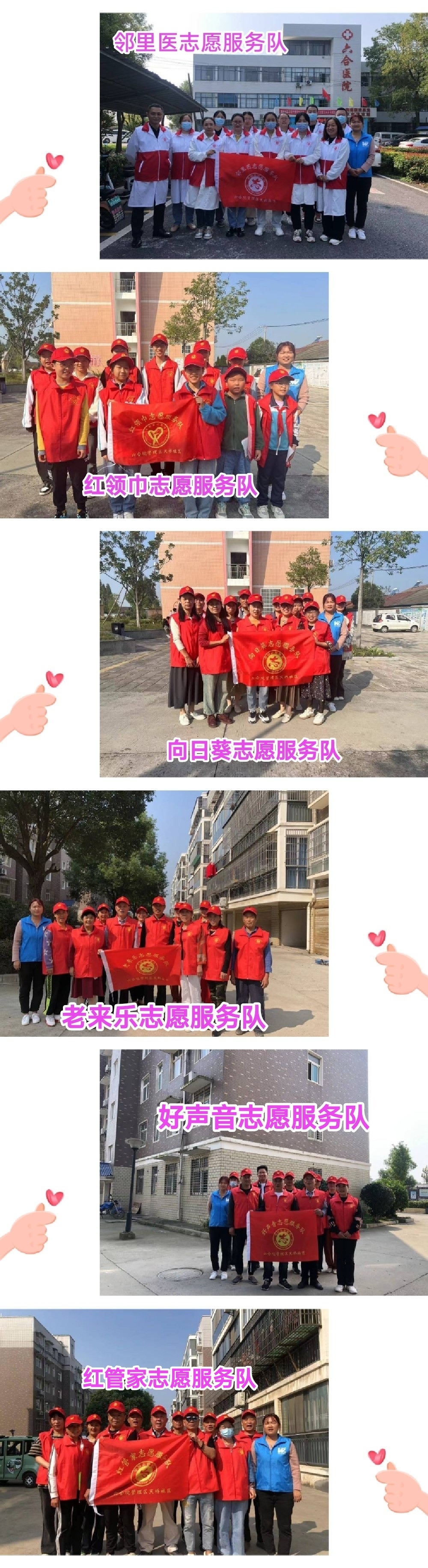作为湖北省省级示范点,在县民政局正确领导下,在六合垸管理区、民政办的大力支持下,天桥社区发挥社工主导作用,孵化招募六支志愿服务队,分别是:红管家志愿服务队、邻里医志愿服务队、老来乐志愿服务队、向日葵志愿服务队、好声音志愿服务队和红领巾志愿服务队。六支志愿服务队将作为志愿服务先锋,深入天桥社区各领域,宣扬志愿服务精神,共同为建设和谐、美丽、幸福六合注入新活力。