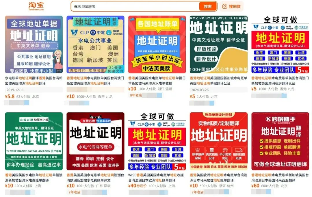 • 电商平台公然贩售虚假文件,“几可乱真”:在知名电商平台搜索 “香港地址证明”,数十家商家立即弹出,报价从数百元到数千元人民币不等。